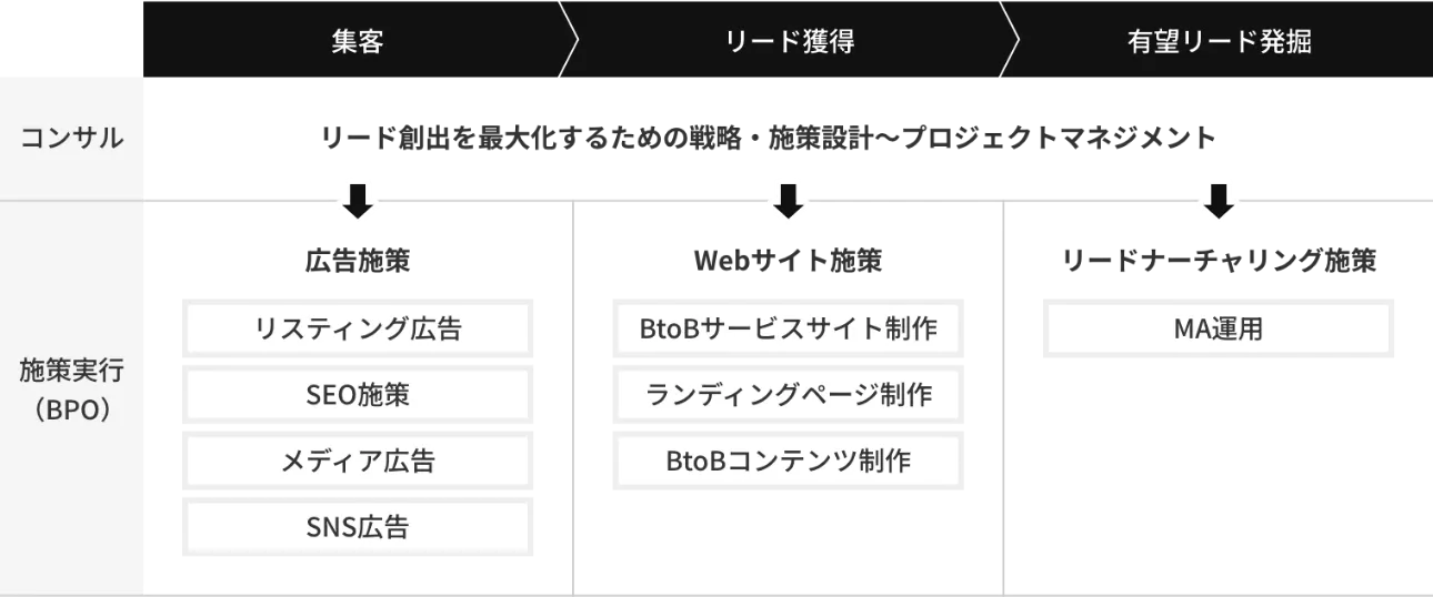 当社のBtoBマーケティング支援サービスは、「BtoBマーケティングに取り組みたいが、知見やリソースが不足している」という企業様向けに展開しております。そのため、BtoBマーケティングにおける「知識的課題」と「リソース課題」の両方を解決するためにコンサルティング機能とBPO(実行)機能の両方を整備しています。